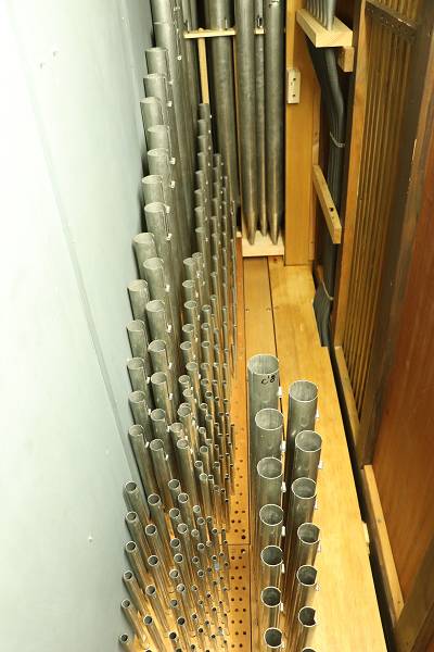 polierten Prospektpfeifen des Pedalwerks sind wieder eingebaut. Von der