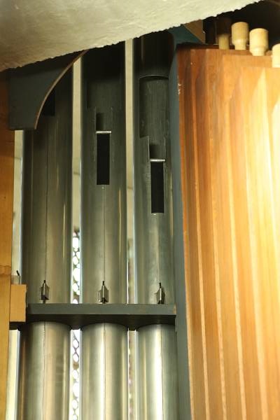 Rückpositiv ohne Prospektpfeifen. Gut zu erkennen sind die neuen Wartungslampen, die inzwischen auch in Betrieb sind.