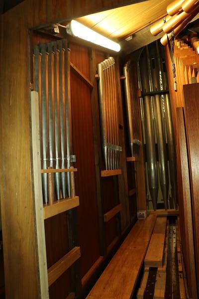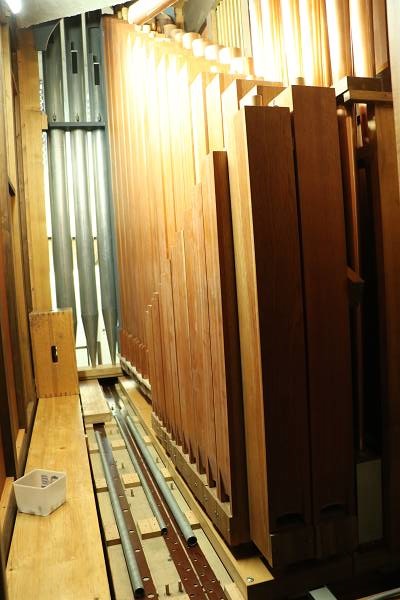 Blick in Richtung Prospektpfeifen mit den neuen Holzpfeifen des Gedecktbass 8'.