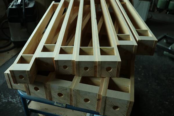 Mit den aufgeleimten Deckeln und Böden werden die Seitenbretter zur vollständigen Pfeifen. Sie wurden abgelängt und verputzt.