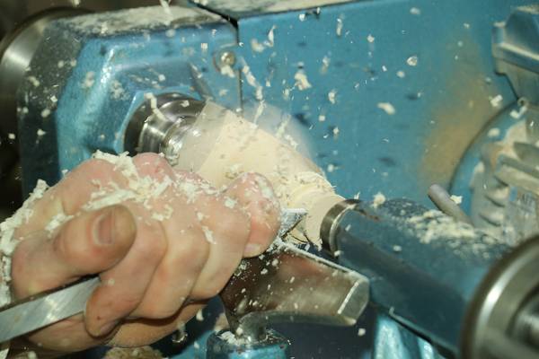 An der Drechselmaschine werden die Spunde hergestellt. Da dies aus dem vollen Material gemacht wird, ...