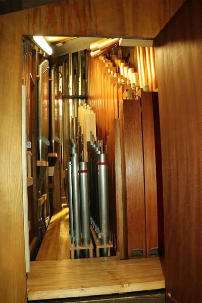 Rückpositiv ohne Prospektpfeifen. Gut zu erkennen sind die neuen Wartungslampen, die inzwischen auch in Betrieb sind.